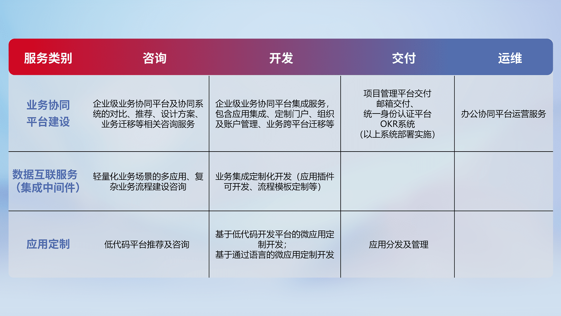 针对钉钉、、、企微、、IDaas等平台级产品提供产品的规划、、方案、、交付、、定制化开发等服务,,,实现如统一协同办公、、智能客户服务、、混合会议管理、、、、智能数据查询、、、、等业务场景,,,实现数字化转型。。。
